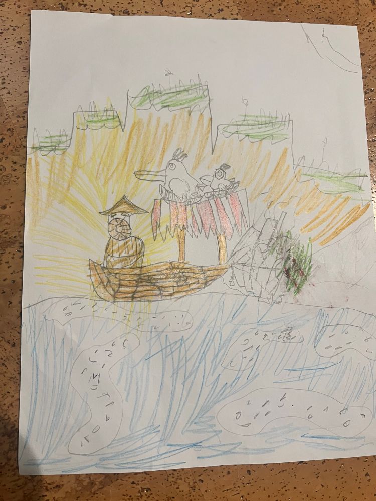 Finished Keeper yesterday and my kids loved the art - below thenlighthouse by my 9yr old and the ‘boat dragon’ by my 7yr old. Thanks @doublefine.com for inspiring them! @timshafer.bsky.social @spaff.bsky.social