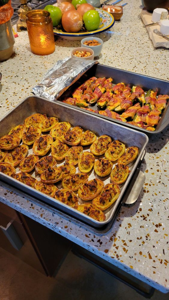 Not knowing what in the hell is an appropriate appetizer for Thanksgiving, I made mini stuffed baked potatoes and bacon wrapped japaneno poppers.