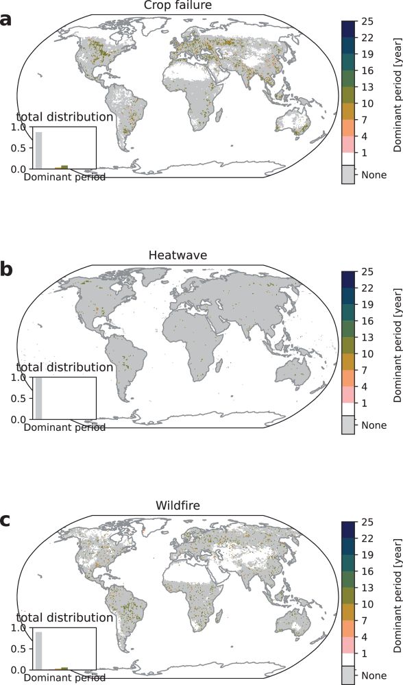 Nature Communications - This work investigates changes in regularity of crop failure, heatwave and wildfire exposure for different future climate scenarios. Major shifts in dominant periods are...
