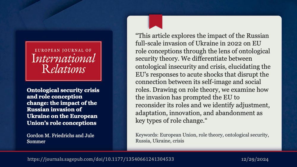 New article out now with the @ejir.bsky.social on "Ontological security crisis and role conception change: the impact of the Russian invasion of Ukraine on the European Union’s role conceptions“ available via open access here: journals.sagepub.com/doi/10.1177/...