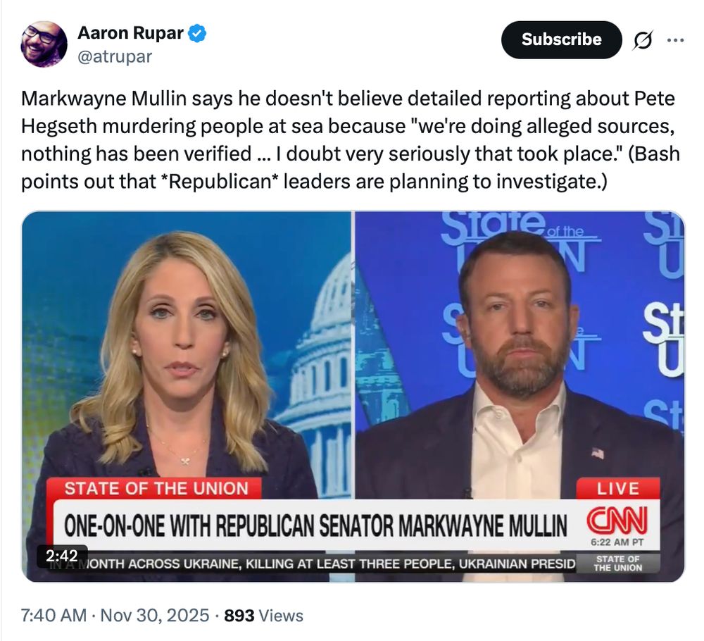 Guilty parties in these murders on the open seas include *at least*: Trump –> Hegseth –> Bradley –> Sailor who pushed the button.