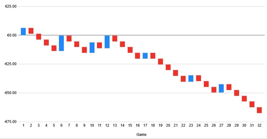 I bet €5 on every underdog in every March madness RO64 game. Here it is, visualized. Maybe this no longer works in the NIL era #marchmadness #datavisualization