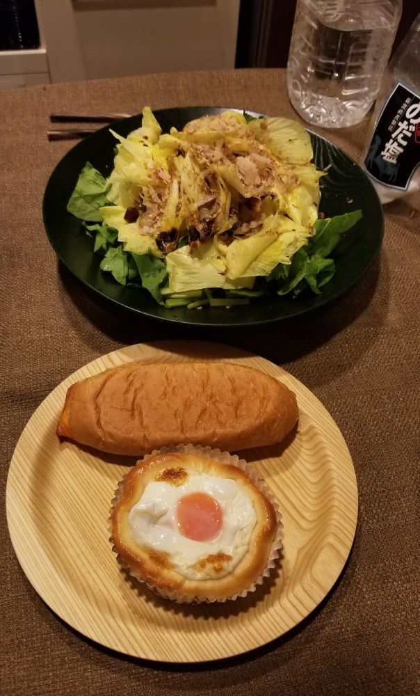 夜は以前買って美味しかったコットンフィールドさんのパンと道の駅しょうなんで買ったオクラの花とルッコラのサラダ。