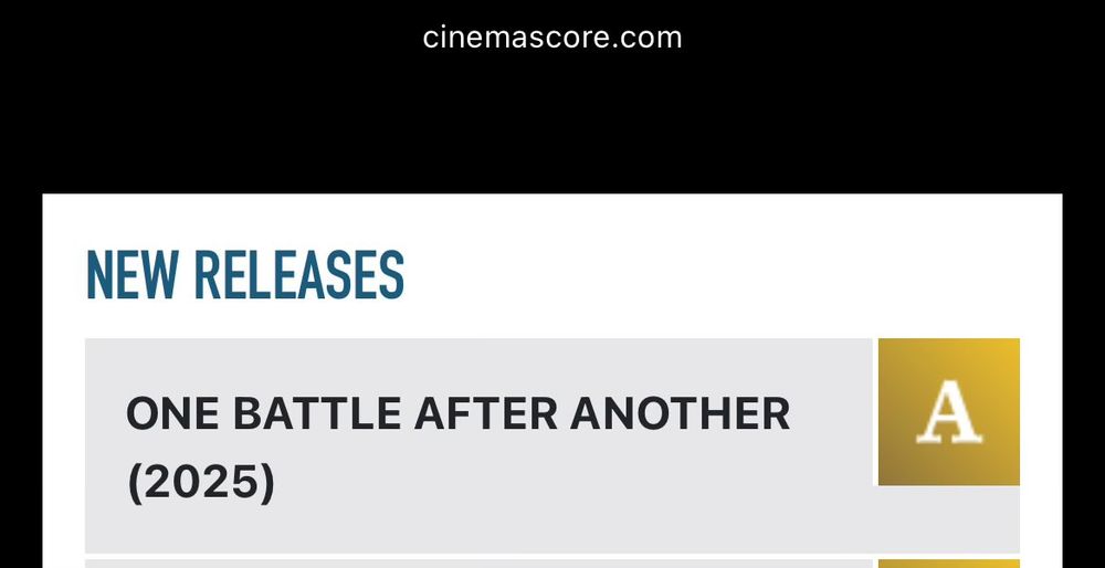 So One Battle After Another just scored an A CinemaScore. Handedly the reported best of PTA's career (beating Boogie Nights's C) and shocking the second best of Leonardo DiCaprio's career - the only other film of his to score above an A- is Titanic.