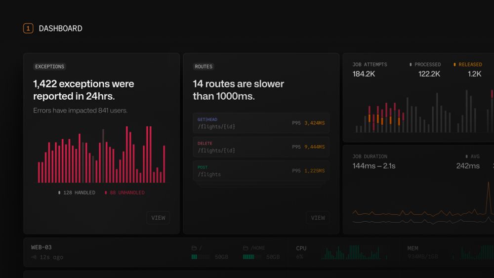 The Nightwatch Dashboard provides an instant overview of your application's health. It surfaces and summarises your data's most critical exceptions and performance issues. It also provides immediate insights into your server's health and identifies users experiencing higher issues. 🚀