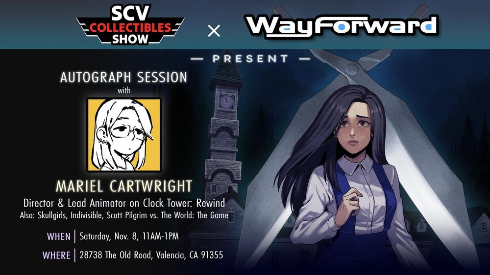 As part of the SCV Collectibles Show grand opening, Mariel Cartwright (@kinucakes.bsky.social), director of Clock Tower: Rewind and artist on numerous high-profile titles, will be at the WayForward booth for an autograph signing on Saturday from 11AM-1PM! We'll have copies of the game too!