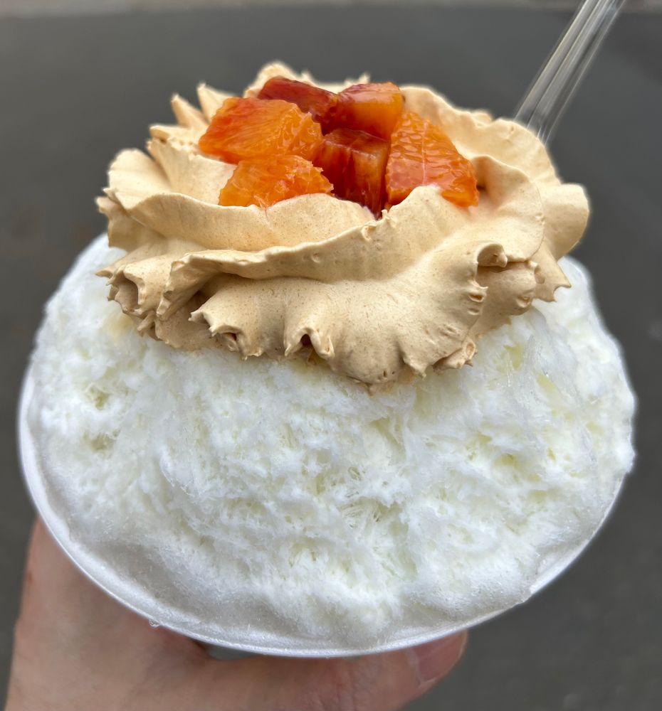 ブラッドオレンジンジャーとビターキャラメルのかき氷。日光天然氷で。