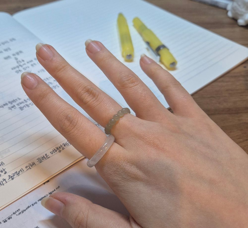 그러니까 이렇게... 투명한 듯 아닌 듯 미묘하게 내포물들이 모였다 흩어졌다 하면서 전체적으로는 얼음 느낌을 내는 흰 비취 반지가 제 취향에 잘 맞는지라+현재 수중에도 있는지라 보여드리고 싶었습니다 빛나라 혼신의 자연광 샷!!!