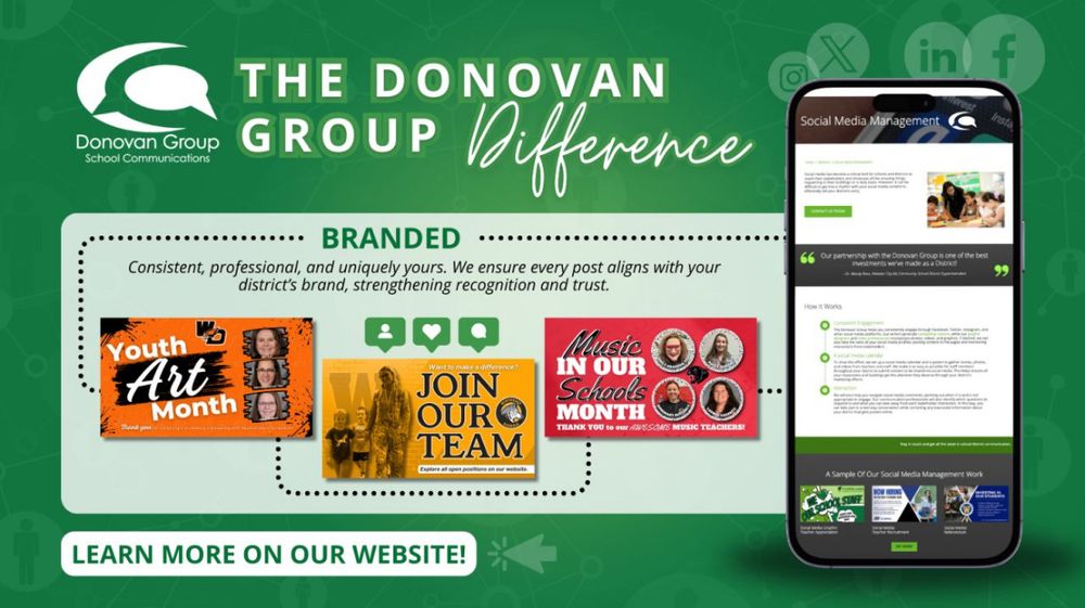 Consistency builds trust—and the Donovan Group delivers social media content that’s branded to your school district. Every post reflects your style, colors, and voice to strengthen recognition and connection with your community. 🎨