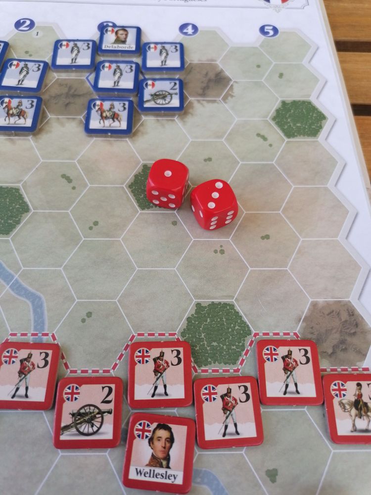 Los 5 y 6 son impactos. Cada 4 causa la retirada de 1 hexágono, y 1, 2 y 3, fallos. Mala tirada de la artillería. Vaciamos un poco el entro y basculamos a la derecha para evitar su artillería.