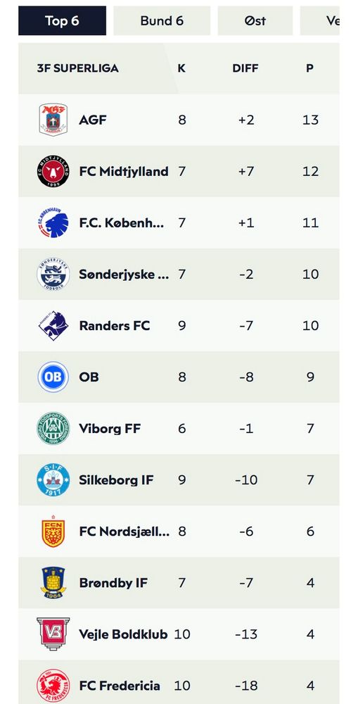 #KSDH og #Midtjylland HELT i top, #FCFredericia og #VejleB HELT i bund. Vildt at der kun er skabt hhv. 10 og 11 point mod AGF og FCM #sldk 🍲