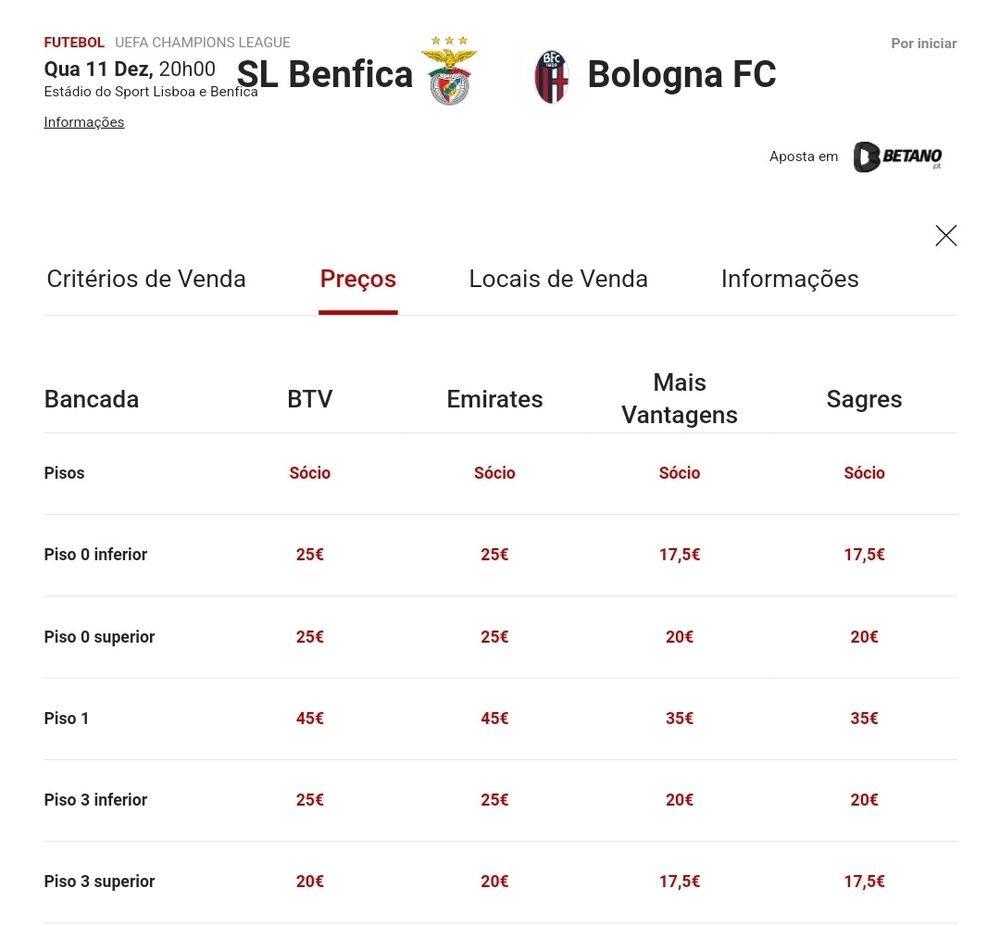 ℹ️ Os bilhetes serão enviados para o mail disponibilizado no ato da compra, até 12h antes do jogo.