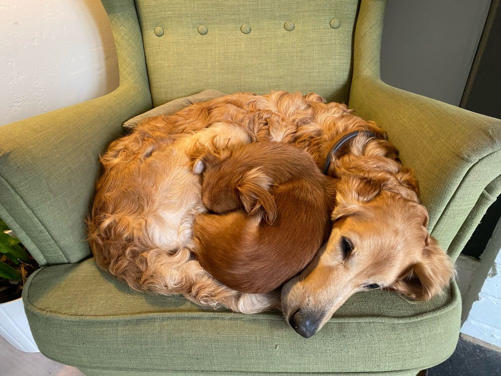 Snuggled up under Sadie’s legs or sprawled on top of her is Maisie’s happy place 🤍🤍