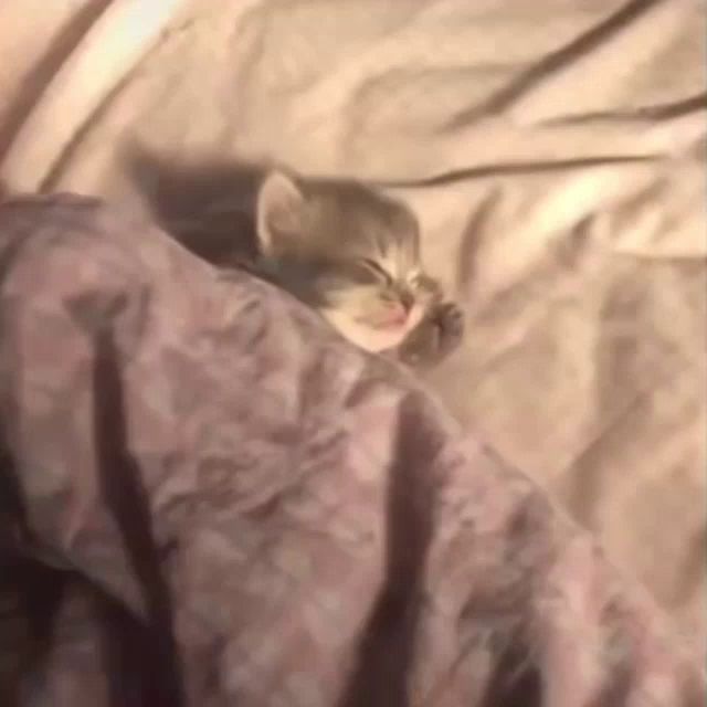 a small kitten is sleeping on a bed with a blanket