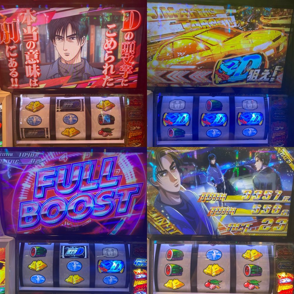 レジェンドバトル(CZ)の当たりは軽いもののラッシュにはなかなか入らず7スルーで回数天井でラッシュ突入。なつき画面だったのでATレベルが2以上だったおかげで継続バトルに勝ち続けて10戦目の涼介にも勝ってフルブースト獲得。ボーナスも上手い具合に絡めて継続させてエンディングまで行ったけどツラヌキ要素のCZ失敗でヤメ。継続バトル中に弱点役を引けた時とリーチ目引けた時の気持ちよさはやっぱ良い。個人的には好きな台。
