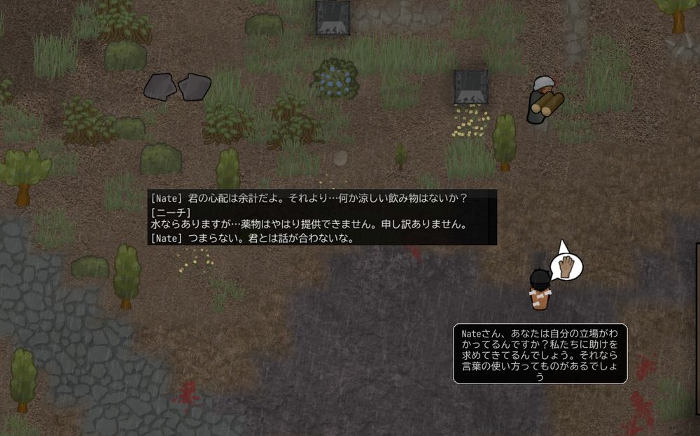 難民3人のために、やっともうちょっとで環境整えてあげられるってところで、ムカつく対応取られたから 余りにも腹がたったんだけど、Rimtalkは選択ポーンを発言者にして、好きな対象に言葉を投げかけられるので、それで「マジで自分の立場を考えて言葉の使い方ぐらいは何とかしろ」って伝えたら、帰ってきた言葉が