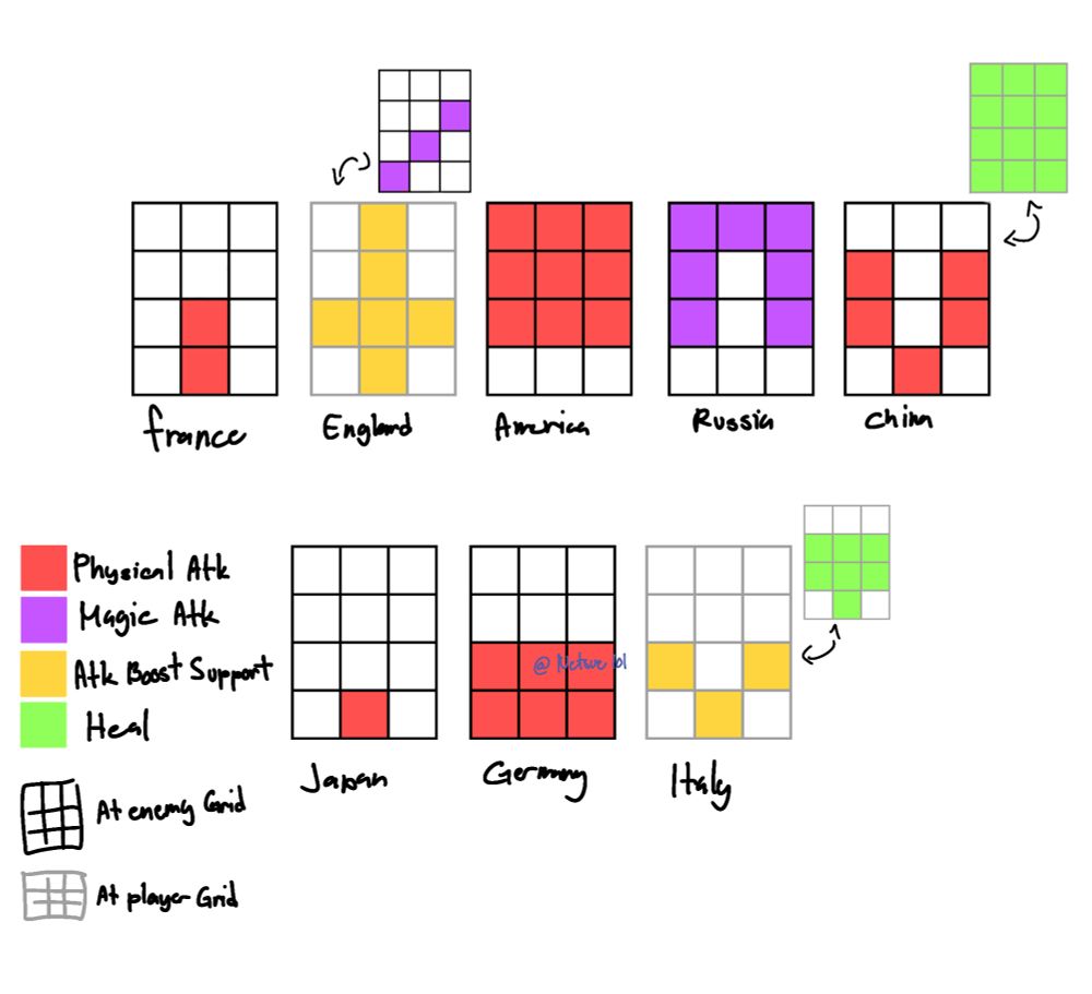 1) So in my dreams, someone leaked the moveset range of the main casts looking like this. Though in my dreams, they have colors of their theme but I decided to opt for a systematic way to understand wtf is going on