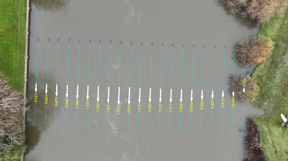 Nerdy tech time - note the 2 #HydroSTIV-processed drone videos - average surface velocity 0.93 on Nov 26th & 0.92 today. Also note slightly higher water level in the sunny image.