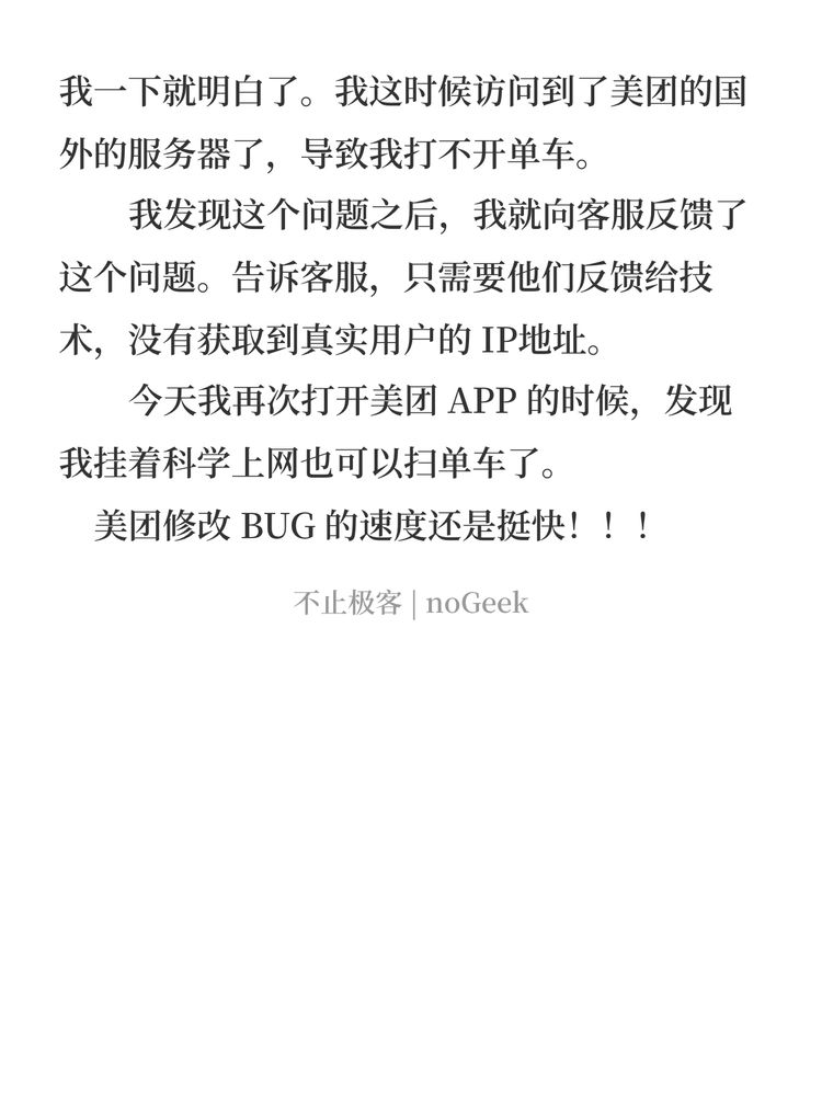 这个东西我作为一个技术人来看呢,其实我一下就明白了。我这时候访问到了美团的国外的服务器了,导致我打不开单车。