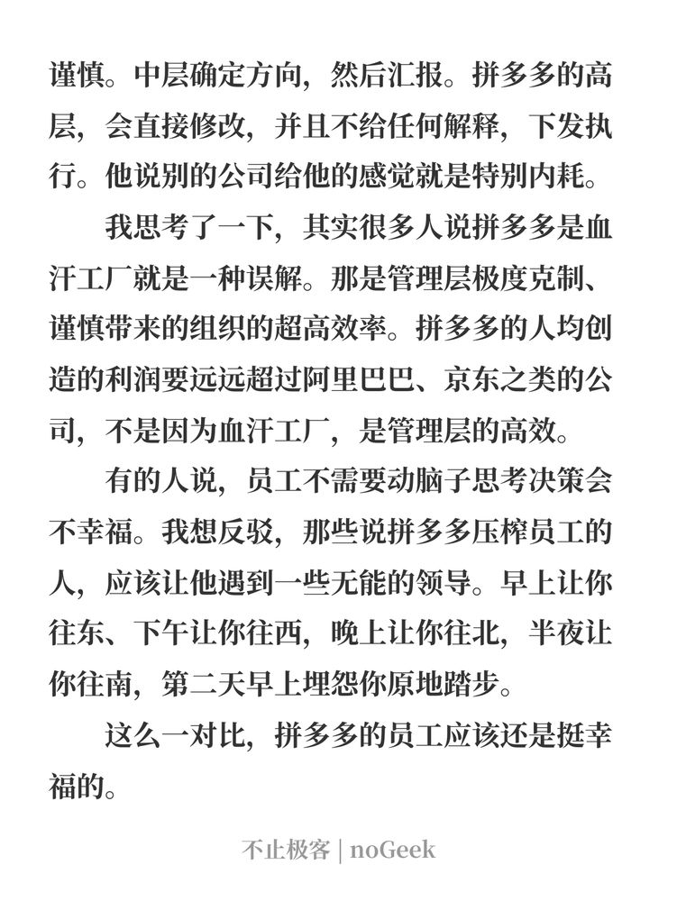 他说管理层的方向和决策会特别地克制和谨慎。中层确定方向,然后汇报。拼多多的高层,会直接修改,并且不给任何解释,下发执行。他说别的公司给他的感觉就是特别内耗。