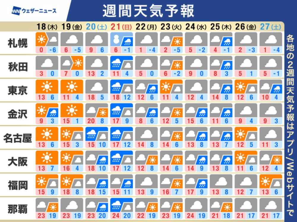 明日以降、寒気の顕著な南下はみられません。週後半には西日本や東日本を中心に暖かな空気が流れ込み、週末は全国的に季節外れの暖かさになる予想です。