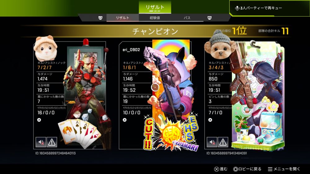 画像は昨日ランクでチャンピオンとったやつと、久しぶりにスパレジェ出て思わずスクショしたものw