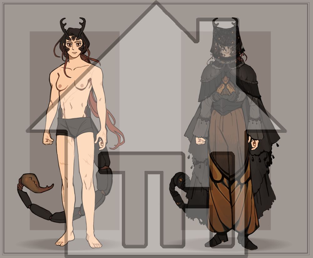 i spoke a bit about amber in a different thread, but ill talk abt oleander and seraph now!! oleander is a cursed chimera - it was searching for a way to gain power and was punished for his hubris instead. now his body routinely reforms and remakes itself in an unbelievably painful process,