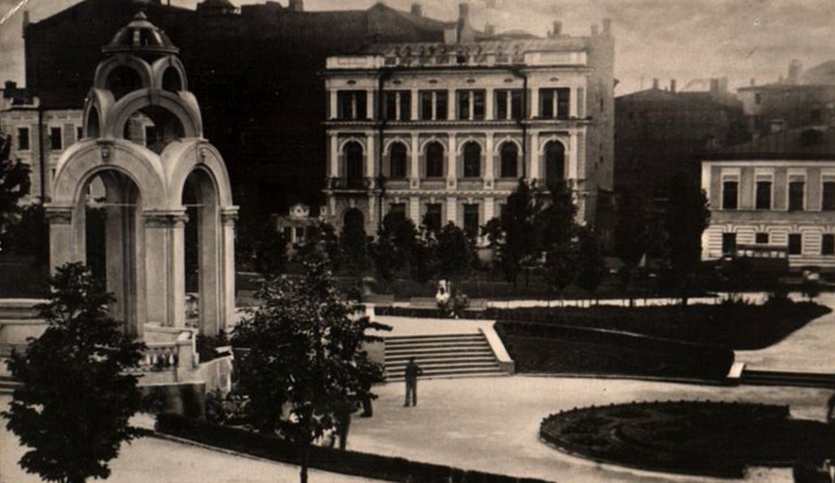 На фото Сергіївський майдан, початок Клочківської та Благбаз, в 1944 або 1945.