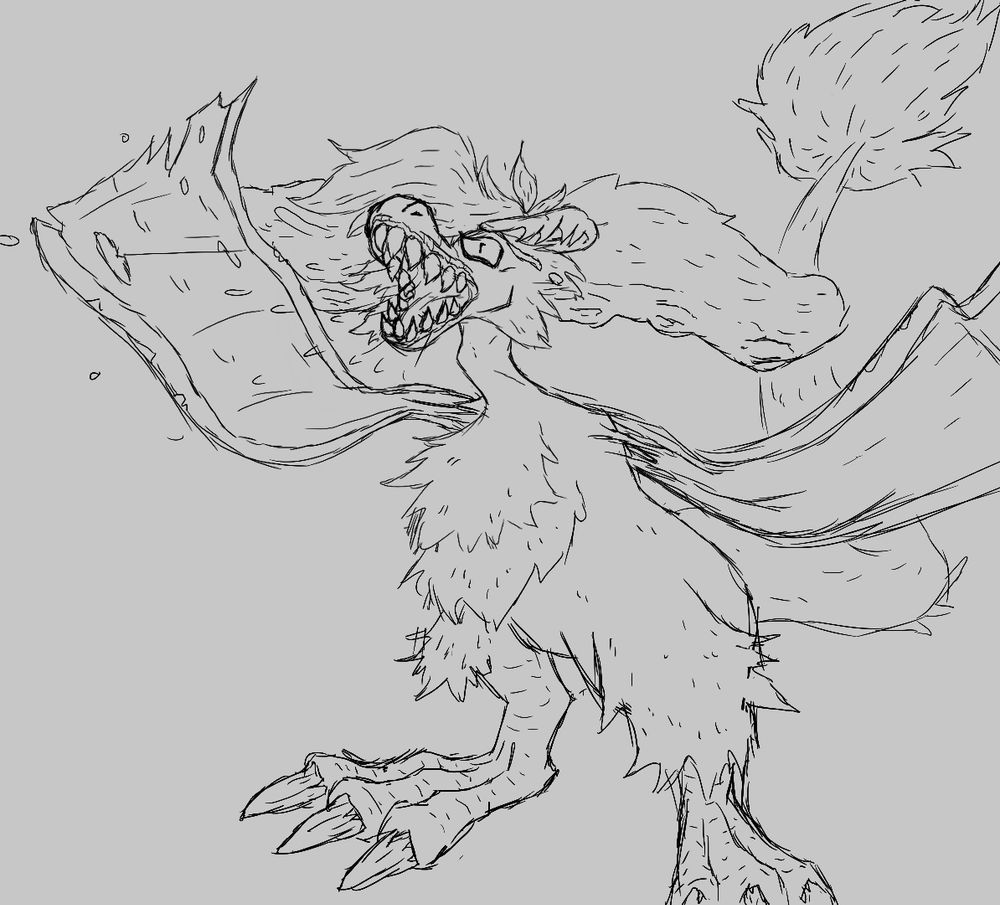 Drew @dynocation.bsky.social ‘s character in a feral manner 🐲