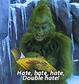ALT: a grinch reading a book with the words hate hate hate double hate