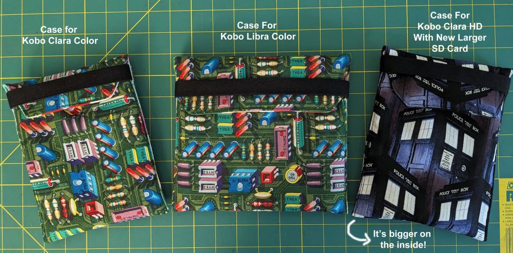 Newly sewn e-Reader cases! One for my spouse's new Kobo Libra Color, one for my new Kobo Clara Color, and one for my old black & white Kobo Clara HD with its newly replaced 32GB SD memory card. Thus the #DoctorWho fabric because it's now bigger on the inside! :)