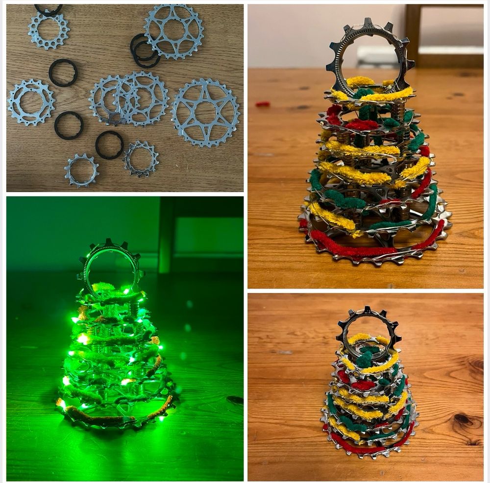 Take a range of different wheel sizes, some wood, an old fake tree, 100 fairy lights (remote control, no less)… add a couple of hours work and some head-scratching… and we have a wee decoration for our outdoor, side-of-the-house, seating area.