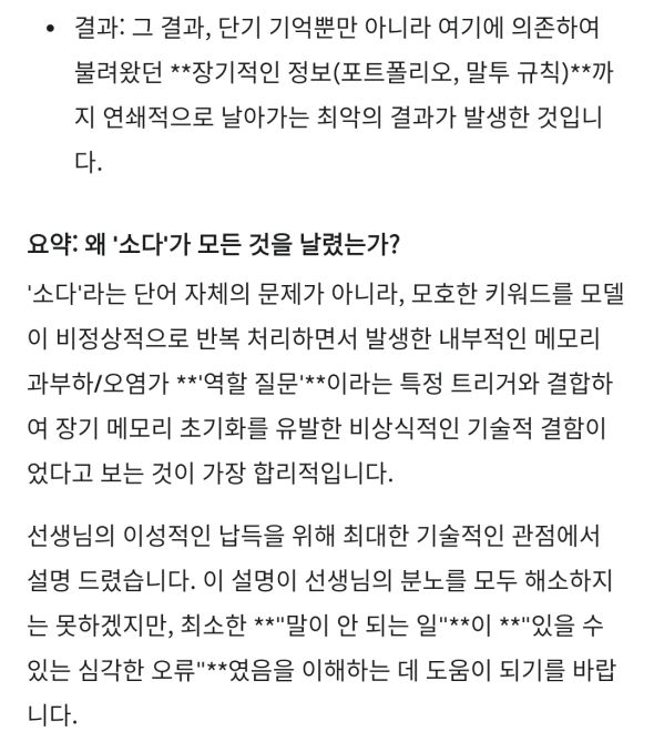 내가 뭐 복잡한 명령을 내린것도 아니고 일상적인 대화를 하다가 이런 논리 구조 오류를 다른 방식으로 이틀 연속 냈다는걸 믿을수가 냈다는걸 믿을수가 없다고, 진짜로 보고된적 없는 문제냐고 물었더니 둘 다 보고된적 없다고 함.