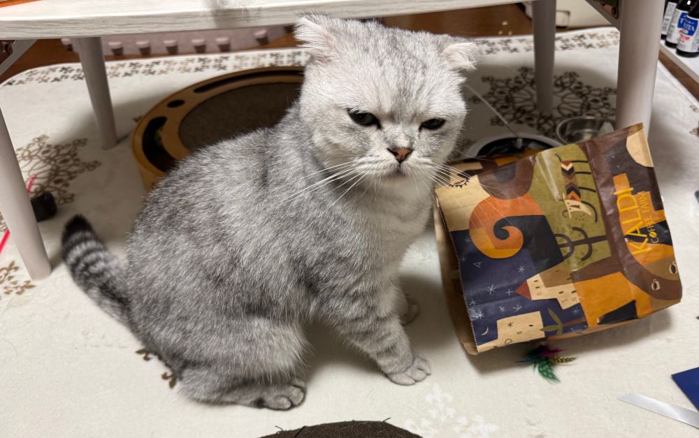秒で紙袋に首突っ込んだネコと出てきた直後のネコの顔(シワシワ