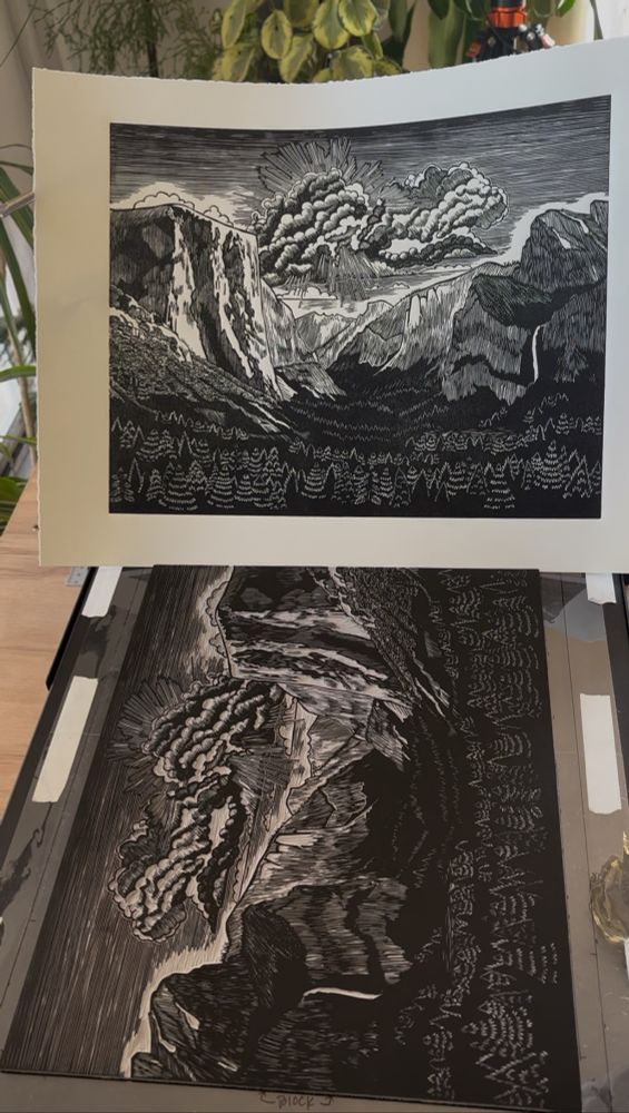 Yosemite Valley linocut work in progress. I decided to make my life harder by going with a stippling texture in the area below El Cap. I hope it pays off 🤞