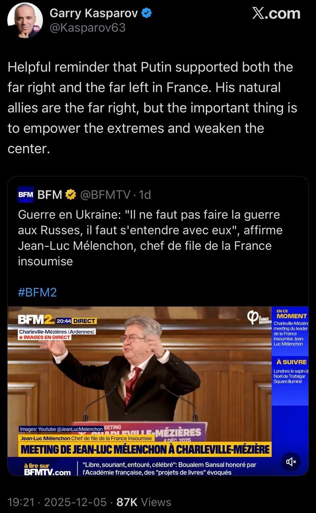 Poutine a vite compris le danger qu´il représentait, il avait ses 2 guignols Mélenchon/Le pen en place pour détruire le centre.