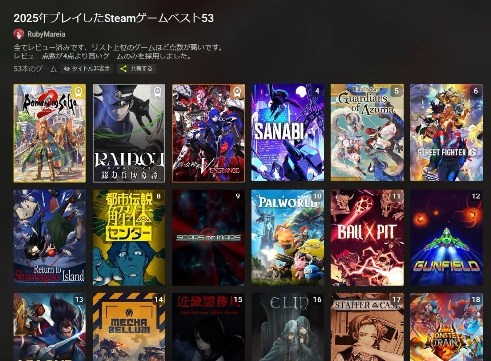 数が多すぎて絞れなかったから、レビュー点数が4.1以上のゲームだけを採用したけどそれでも53件になった。