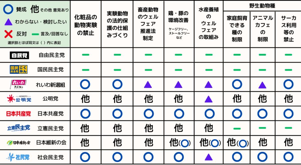 PEACEなどが行った、動物の保護に関する政党アンケート(動物実験やアニマルウェルフェアに関することなど)の回答が出てた。