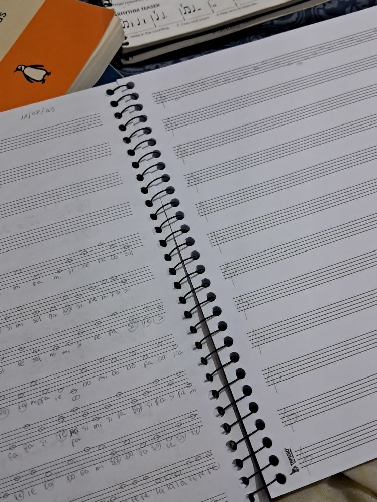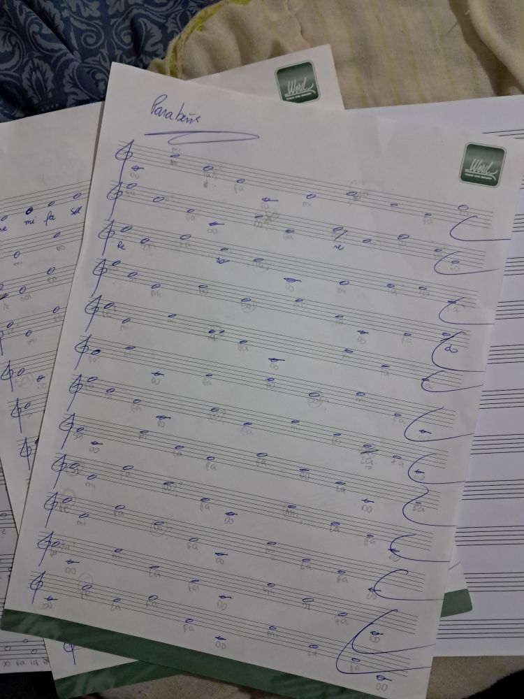 Primeira aula, me passaram exercício pra identificar as notas na partitura, também sobre ritmo e os tempos