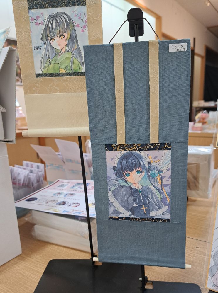 参加中のイラスト展会期中に覚えた掛け軸。紙での練習から布に移行。練習中だけどうちに飾りたいなーと思ってくださる方向けにお値段つけさせてもらったらお迎えあって嬉しい😭