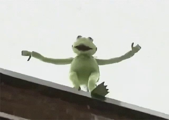 ALT: a kermit the frog is sitting on a ledge with his arms outstretched