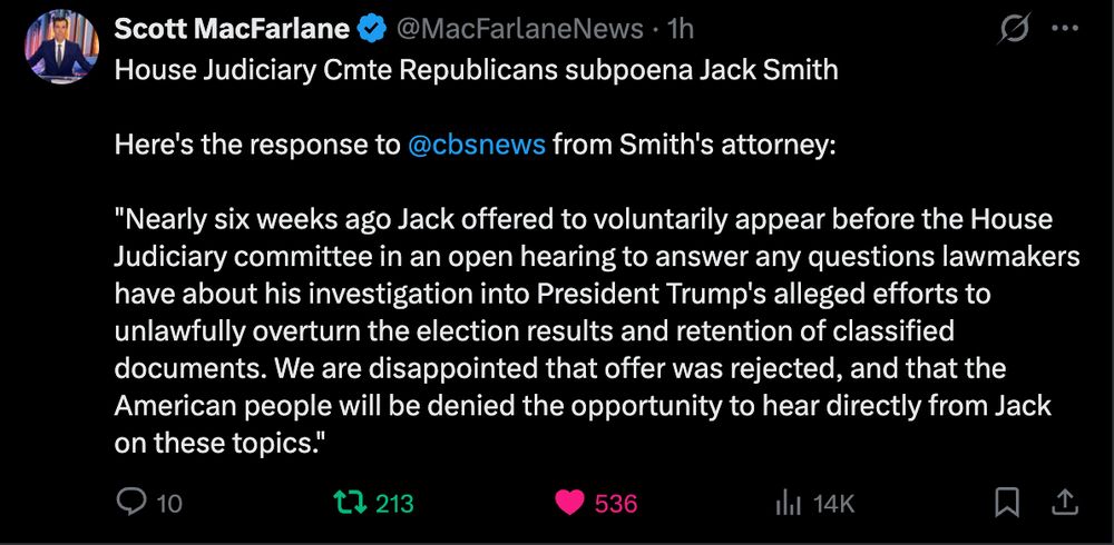 The House Judiciary Committee issued a subpoena to former special counsel Jack Smith, who led investigations into President Donald Trump, ordering him to appear at a closed-door session later this month.