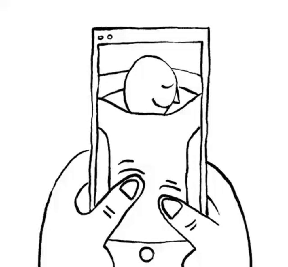 a black and white drawing of a person holding a cell phone with a picture of a person on it .