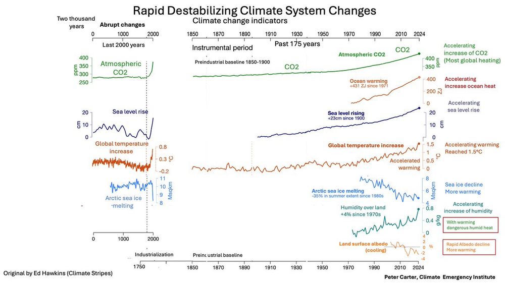 fast as ever, atmospheric CO₂ faster than ever) The sole exception is Arctic sea ice. With increasing emissions, combined indicators indicate a rapid trend to biosphere collapse, add in ocean acidification and deoxygenation