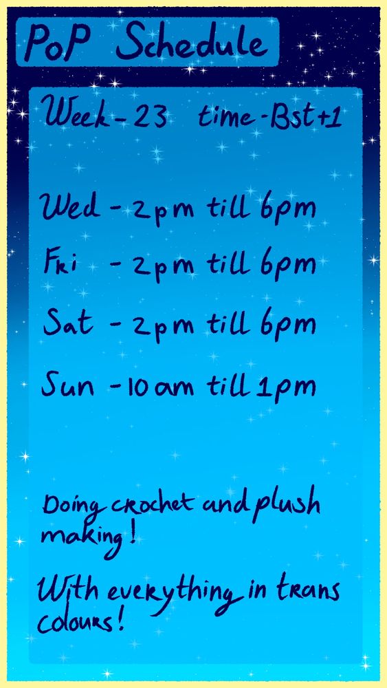 ill be working on a bunch of trans coloured stuff like crochet doilies and table cloths!! but also trans coloured plushies!!