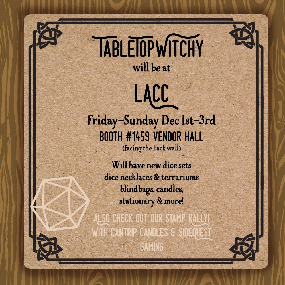 Come stop by for shiny dice AND we'll also be doing a stamp rally with @cantripcandles.bsky.social and @sidequest_socal (instagram)
