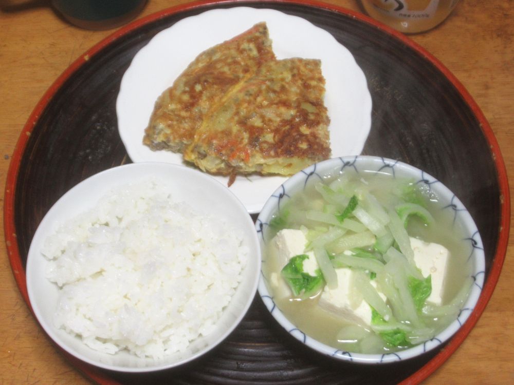 朝ごはんは白菜と豆腐に味噌汁とオムレツです🍚