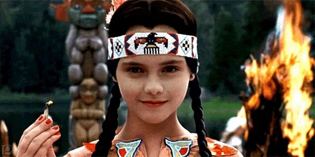 Alt: Christina Ricci, as Wednesday Addams in Addams Family Values, holding a lit match with a fire blazing behind her.