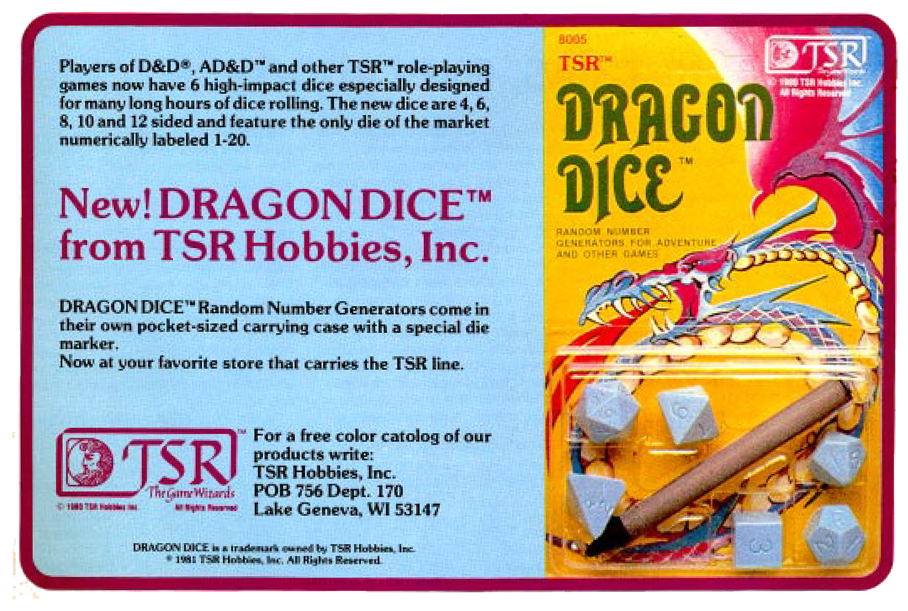 Dragon Dice blister packs were sold in 81 and that’s when dice took off. You could get these in the local drug store.