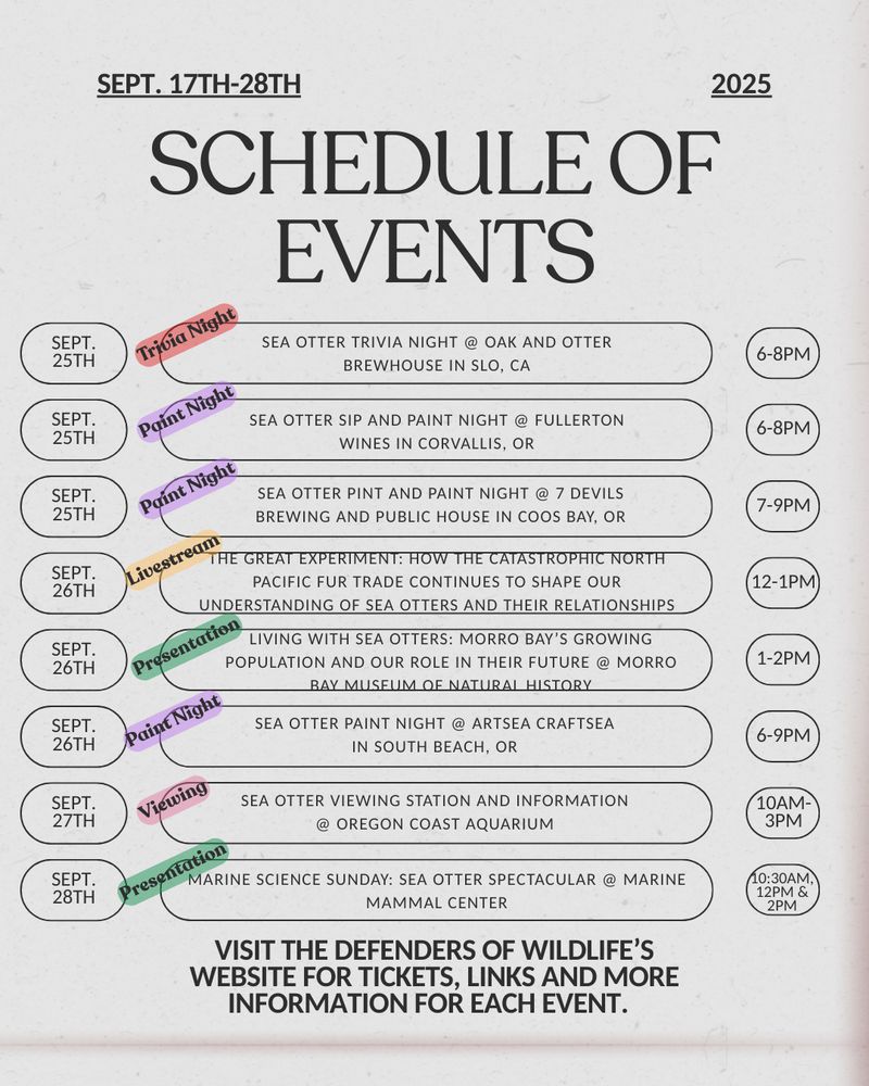 The schedule below is provided by Defenders of Wildlife. For event details, tickets and links, visit their website: defenders.org/sea-otter-aw....